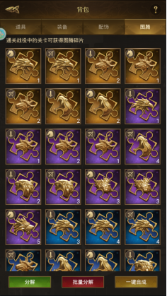 通关战役可能获得不同品质的图腾碎片;有石喙、巨角、毒牙、咆哮、狂怒、掠食的蓝色或紫色图腾碎片,以及石喙、巨角、毒牙的橙色图腾碎片;掉落前提为领主已解锁该栏位;合成橙色及以下品质图腾时,如普通碎片不足,可使用万能图腾碎片替代合成(建议留给橙色品质图腾)。