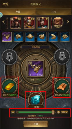 消耗黄金和木材,可对图腾进行升级,所有图腾最高可升级至100级,升级的成功率随升级等级提高而降低,但是每次升级可使用符文石来提升成功率。