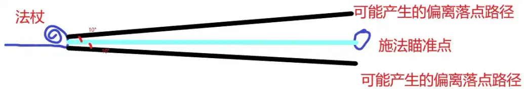 如图所示,法杖和我们瞄准点为一条直线,当我们施法后,法术落点可能会向上偏离,也可能会向下偏离,但偏离角度则为固定的向上10°或向下10°。蓝线为瞄准基本线,两条黑线则为法术的最终落点路径。