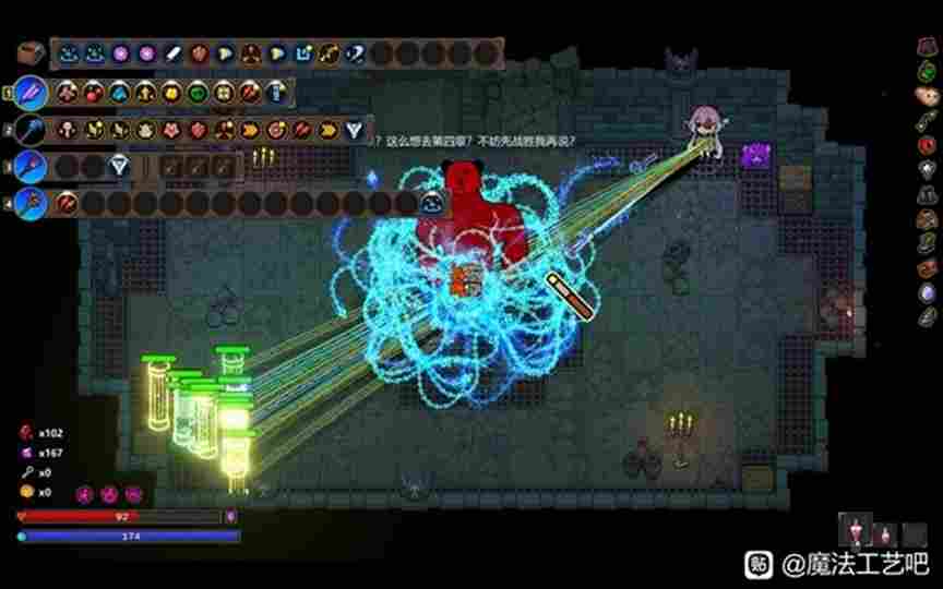 满级后体验极佳稳定20多分钟通关,视情况杀作者。这次推荐的是疾行套装适配法杖【生锈手炮】,可以看到闪电疾行的搭配的法术不是很多,但是在充能槽放上一个扩槽石,无cd触发,轻松沙作者,沙作者时候可以远处歇会,不要贴脸,破魔剑好像会自己触发破魔剑,也可能是我有范围增强