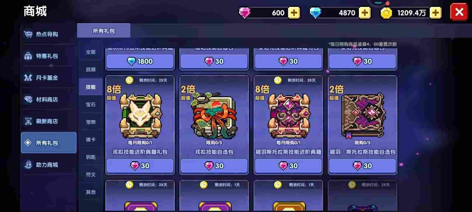 ①商店-所有礼包-技能,直接30粉买橙色和紫色技能。(图3)